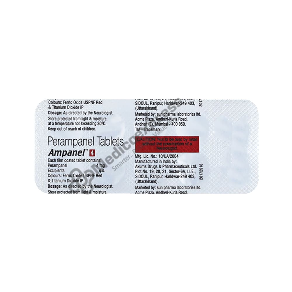 Ampanel 4 Tablet 10 belongs to a class of drugs known as anticonvulsants or anti-epileptics, which are used to treat epilepsy. Epilepsy is characterised by a surge of electricity in the brain. The brain's electrical rhythms become imbalanced in epilepsy, resulting in recurrent seizures and, in some cases, an unconscious state.Disclaimer:For More Information Contact Your Physician