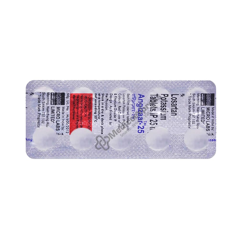 Angizaar 25mg Tablet 15's belongs to a class of drugs known as angiotensin II receptor blockers that are used to treat high blood pressure (hypertension) and lower the risk of stroke in certain people with heart disease. Disclaimer:For More Information Contact Your Physician