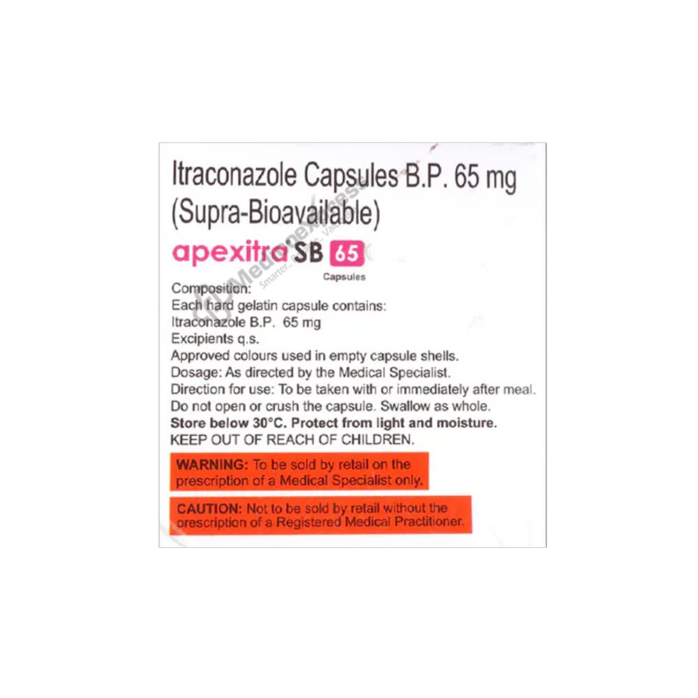 Apexitra Sb 65 Cap 10'S, is used to treat fungal infections of the mouth, throat, toenails, fingernails, or lungs. A fungus assaults the tissue and causes infection in a fungus infection. It is possible for fungus infections to spread (spread from one person to another).Disclaimer:For more information contact your physician.