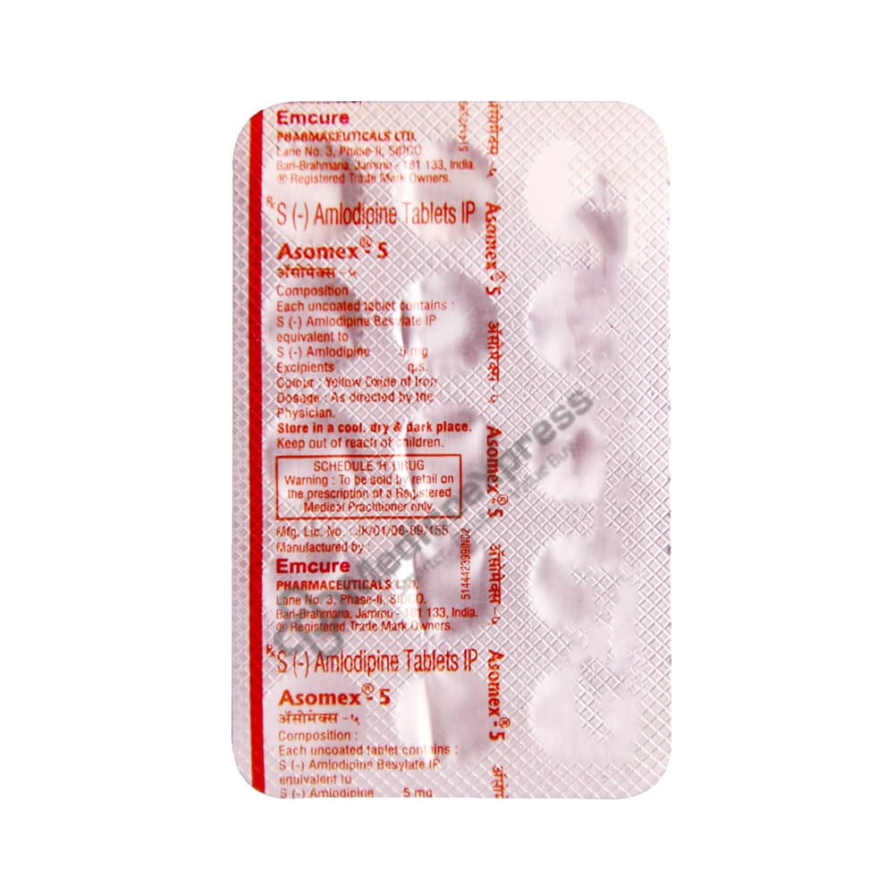 Asomex-5 tablet 15 is a calcium channel blocker medication that is used to treat hypertension (high blood pressure) and angina (chest pain).Disclaimer:For more information contact your physician