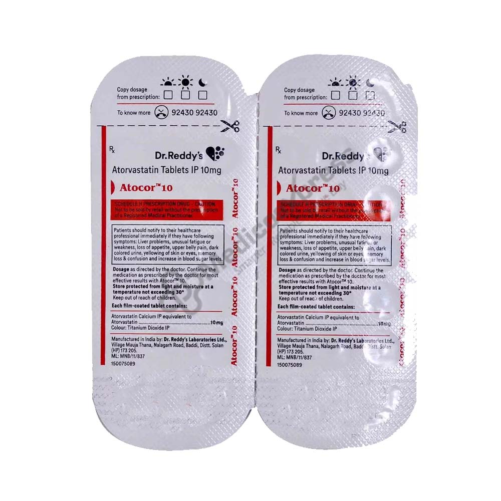 Atocor 10 Mg Tablet 15s, is used to treat high cholesterol levels in the body. Low-density lipoprotein (LDL), or bad cholesterol, is reduced and high-density lipoprotein (HDL), or good cholesterol, is elevated in the blood when taking Atocor 10 Tablet 15s. The buildup of harmful lipid (fat) levels in the blood is known as dyslipidaemia. Low-density lipoprotein (LDL or bad cholesterol), triglycerides, and high-density lipoprotein (HDL) levels are always high in this syndrome (HDL or good cholesterol). Atocor 10 Tablet 15s contain "Atorvastatin," which works by reducing the amount of cholesterol that may accumulate on the walls of the arteries and obstruct blood flow.Disclaimer:For more information contact your physician.