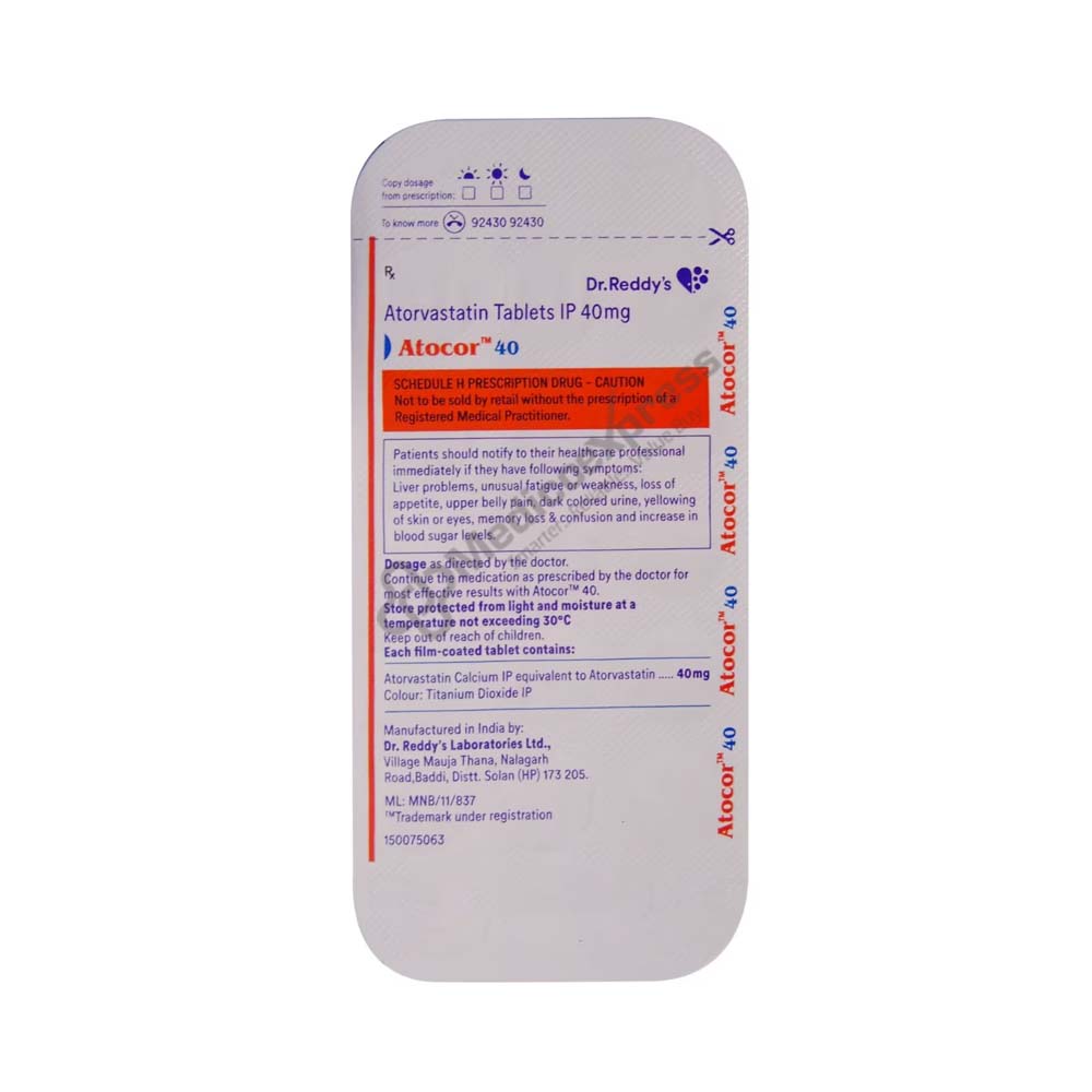 Atocor 40 Mg Tablet 15s, is used to treat high cholesterol levels in the body. Low-density lipoprotein (LDL), or bad cholesterol, is reduced and high-density lipoprotein (HDL), or good cholesterol, is elevated in the blood when taking Atocor 40 Tablet 15s. The buildup of harmful lipid (fat) levels in the blood is known as dyslipidaemia. Low-density lipoprotein (LDL or bad cholesterol), triglycerides, and high-density lipoprotein (HDL) levels are always high in this syndrome (HDL or good cholesterol). Atocor 40 Tablet 15s contain "Atorvastatin," which works by reducing the amount of cholesterol that may accumulate on the walls of the arteries and obstruct blood flow.Disclaimer:For more information contact your physician.