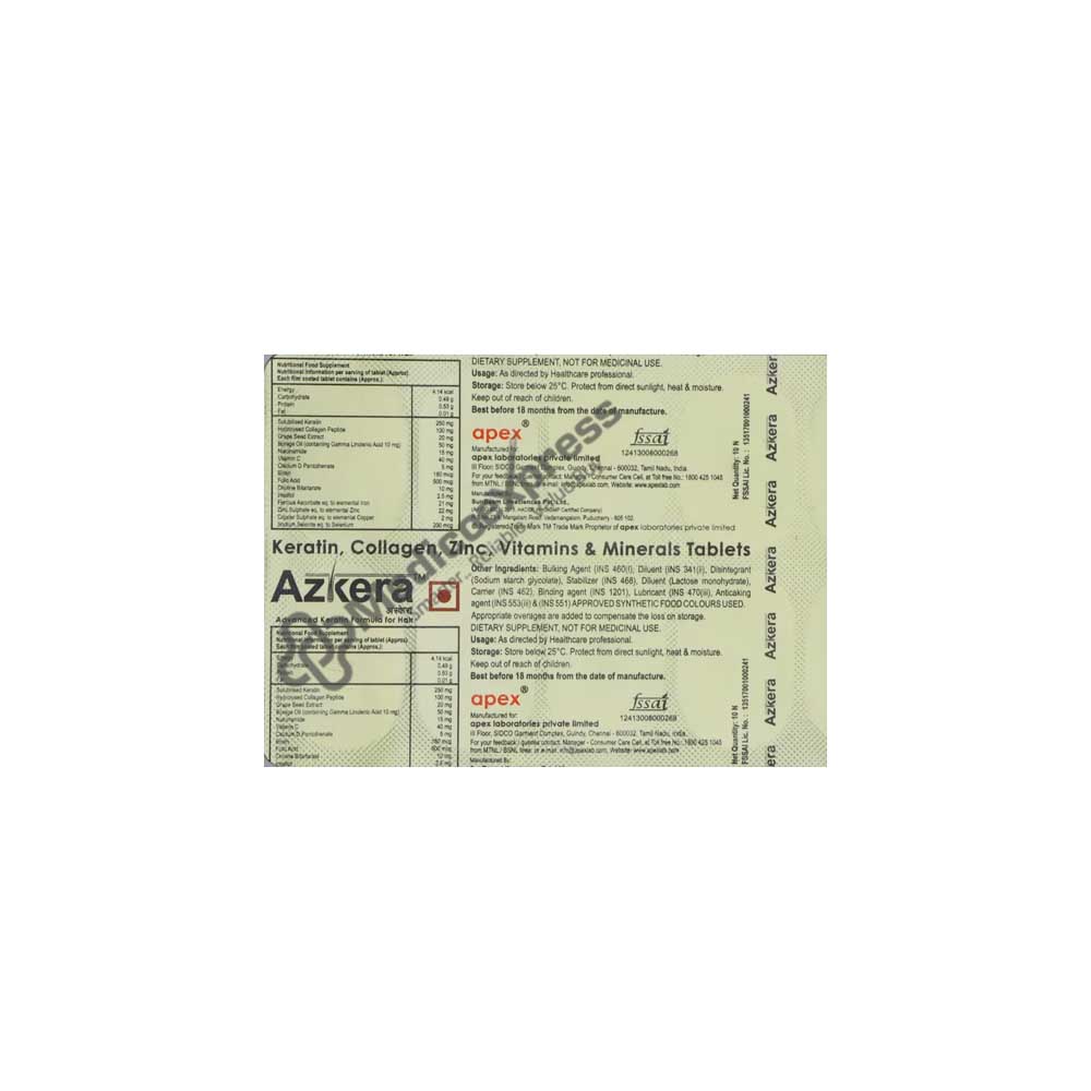 Azkera Tablet is a hair supplement that contains multiple vitamins, minerals, and antioxidants. It contributes to the improvement of hair health. Among the ingredients are keratin, zinc, vitamin B3, vitamin C, vitamin B7, vitamin B9, niacin, grape seed extract, biotin, and calcium. Azkera pill fortifies and strengthens fragile hair from the inside out, making it healthier and more nourished. Keratin synthesis is enhanced, as is blood flow to the scalp and hair follicles.Disclaimer:For More Information Contact Your Physician