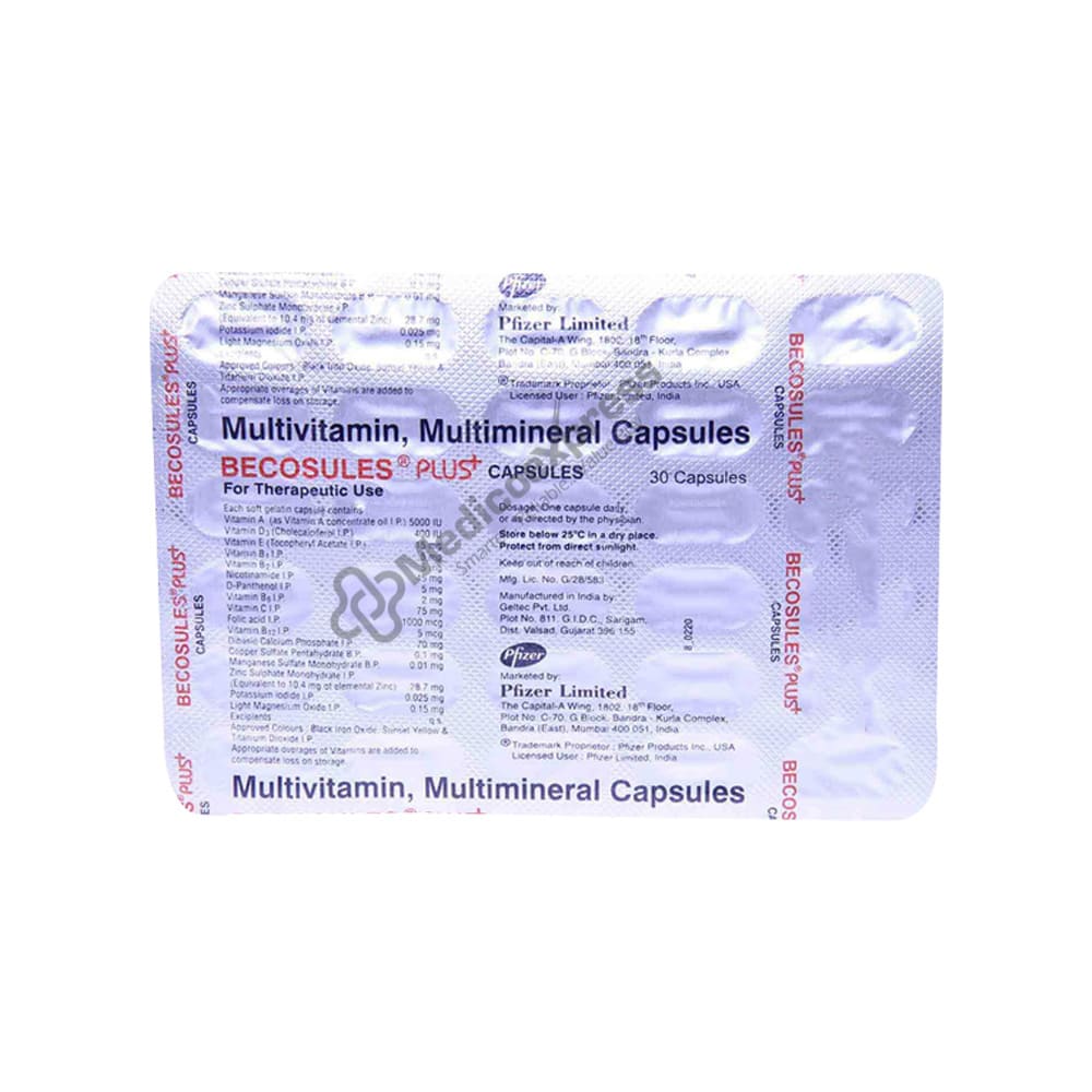 Description :Becosules Plus 30'S a daily health supplement that contains vital nutrients such as multivitamins and multiminerals. Vitamins are required for proper growth, muscular development, and nervous system function. Minerals help to create red blood cells, strengthen bones and teeth, and heal cells.Disclaimer:For More Information Contact Your Physician