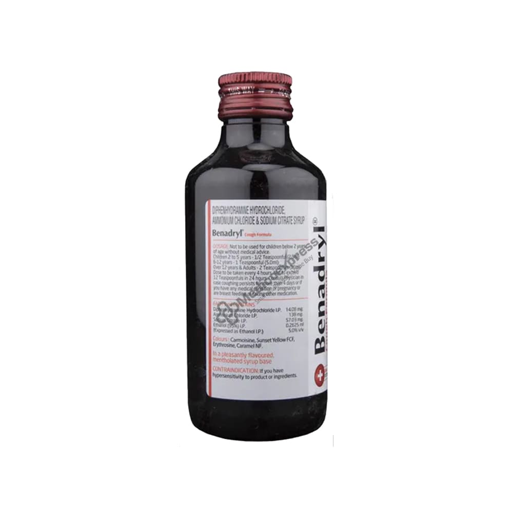Dextromethorphan hydrobromide, found in Benadryl DR Syrup 450 mL, is a cough suppressant. It works by blocking the cough receptor in the brain, which is responsible for coughing. Benadryl DR Syrup 102 mL is commonly used to treat dry cough in the short term.Disclaimer:For More Information Contact Your Physician