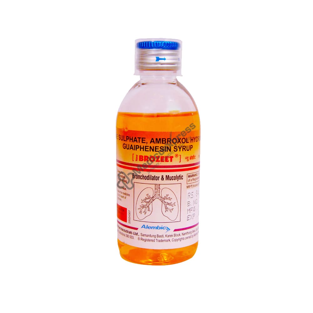 Brozeet Syrup 100 ml belongs to the class of medications known as "expectorants," which are primarily used to treat coughs caused by mucus. Coughing (whether dry or productive) is the body's way of clearing irritants from the airways and preventing infection. Coughs are classified into two types: dry cough and chesty cough. A tickly cough produces no vicious or thick mucus, whereas a chesty cough (wet cough) produces mucous or sputum to help clear your airways.Disclaimer:For More Information Contact Your Physician