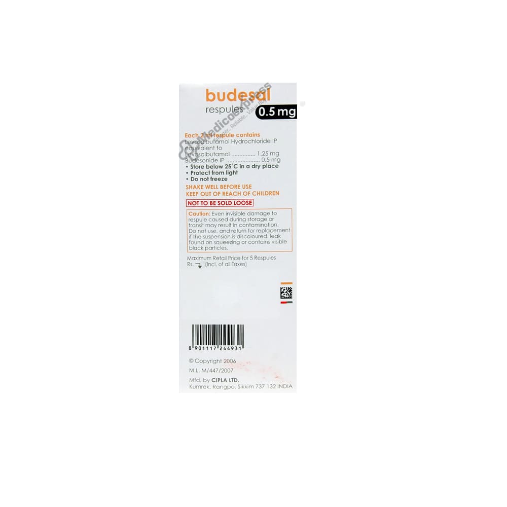 Budesal 0.5mg Respules 2ml is used to treat asthma and chronic obstructive pulmonary disease (a lung disorder in which the flow of air to the lungs is blocked). It aids in relaxing the muscles of the airways and making breathing easier. It relieves coughing, wheezing, and shortness of breath.Disclaimer:For More Information Contact Your Physician