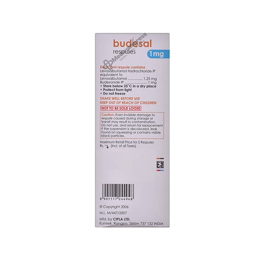 Budesal 1mg Respule 2ml is a medication used to treat asthma and chronic obstructive pulmonary disease (a lung disorder in which the flow of air to the lungs is blocked). It aids in relaxing the muscles of the airways, making breathing easier. It alleviates coughing, wheezing, and shortness of breath.Disclaimer:For More Information Contact Your Physician