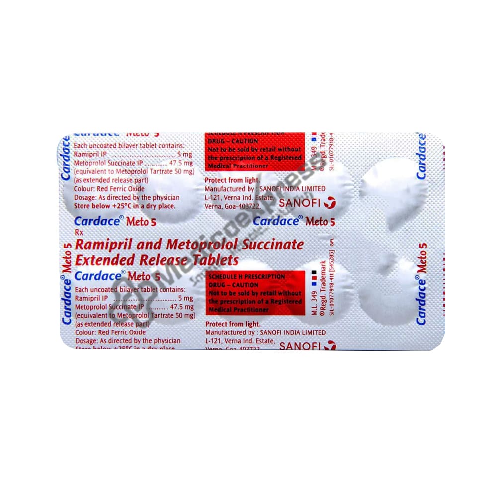 Cardace meto 5 tablet 10's a combination medication that contains enalapril (ace inhibitors) and propranolol (a beta blocker) (beta-blocker). It addresses excessive blood pressure as a whole and reduces the likelihood of eventual heart failure or stroke.Disclaimer:For more information contact your physician