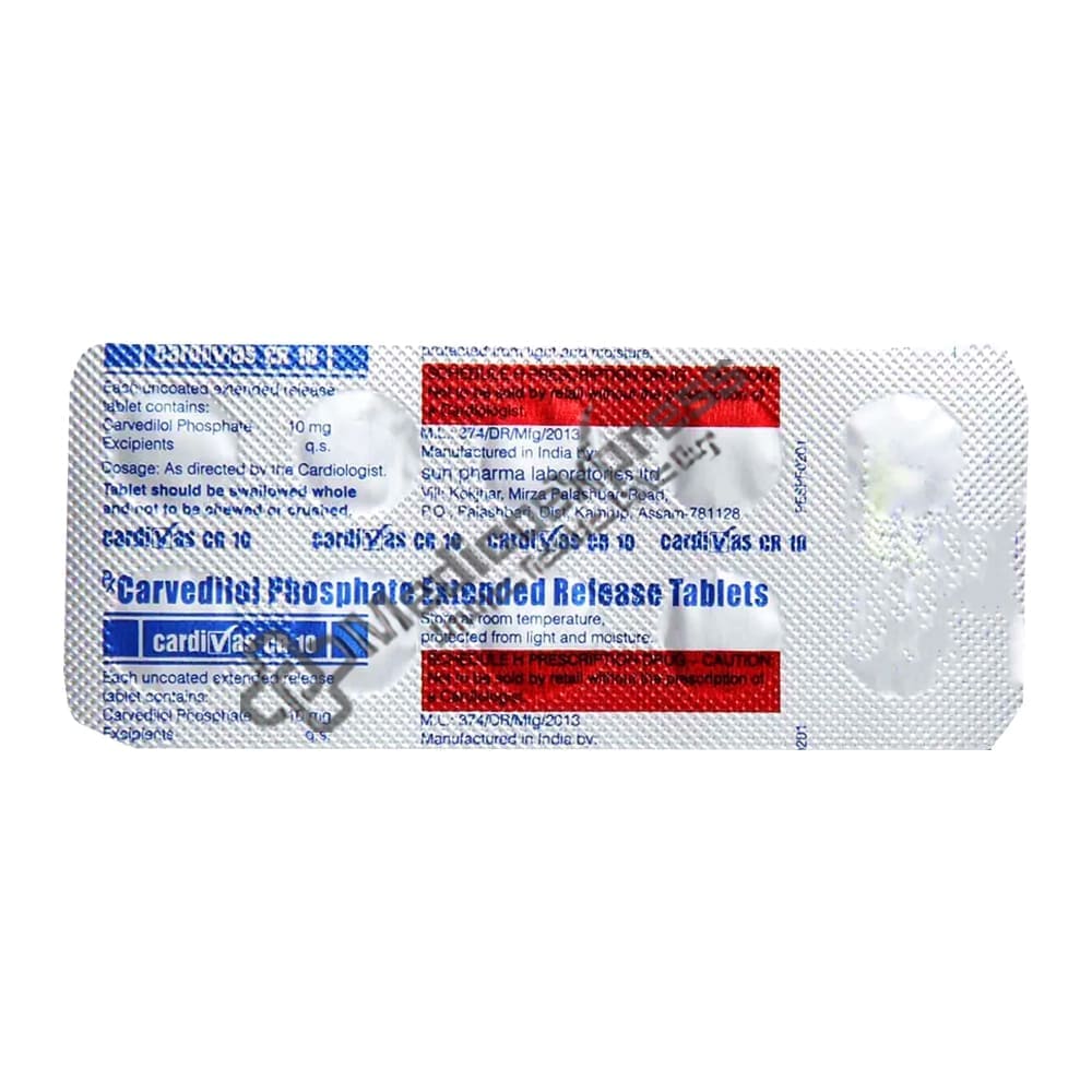 Cardivas CR 10mg Tablet 10 is a beta-blocker antihypertensive medication used to treat hypertension (high blood pressure), moderate to severe heart failure, and angina (heart-related chest pain).Disclaimer:For More Information Contact Your Physician