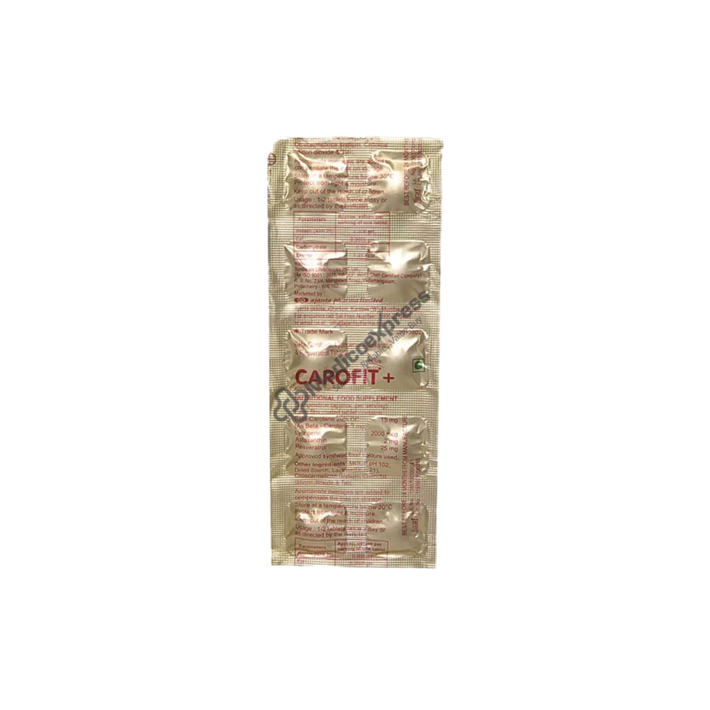 Carofit Plus Tablet 10's contains Vitamins C, B, Folate, Zinc Sulfate, Carotenoids, Selenium, Vitamin E Acetylated, and Chromium. Of the vitamin A, carotenoids account for about 50%. All of these elements act specifically and have a beneficial impact on the health condition. The blood flow and oxygen saturation are improved by several components. Because of this, the organs and tissues will obtain adequate amounts of the nutrients. Some of them have positive effects on how well the central nervous system functions, which means you won't have sleep issues, your risk of developing depression will be lower, and you'll constantly be upbeat.Disclaimer:For more information contact your physician.