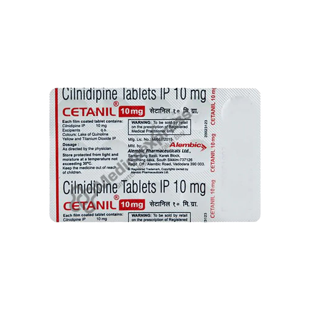 Cetanil 10 mg Tablet 15 belongs to a class of medications known as calcium channel blockers, which are used to treat hypertension (high blood pressure) and angina (chest pain). Hypertension (high blood pressure) is a long-term or chronic condition in which the blood exerts a large force against the artery walls. The higher the blood pressure, the more difficult it is for the heart to pump.Disclaimer:For More Information Contact Your Physician