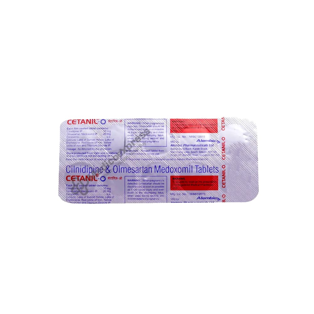 Cetanil O Tablet 10s belongs to the class of antihypertensives, which are primarily used to treat hypertension (high blood pressure). Cilnidipine (calcium channel blocker) and olmesartan are included (angiotensin-II receptor antagonists). Hypertension is a long-term or chronic condition in which the blood's force against the artery walls becomes so great that it causes heart disease.Disclaimer:For More Information Contact Your Physician