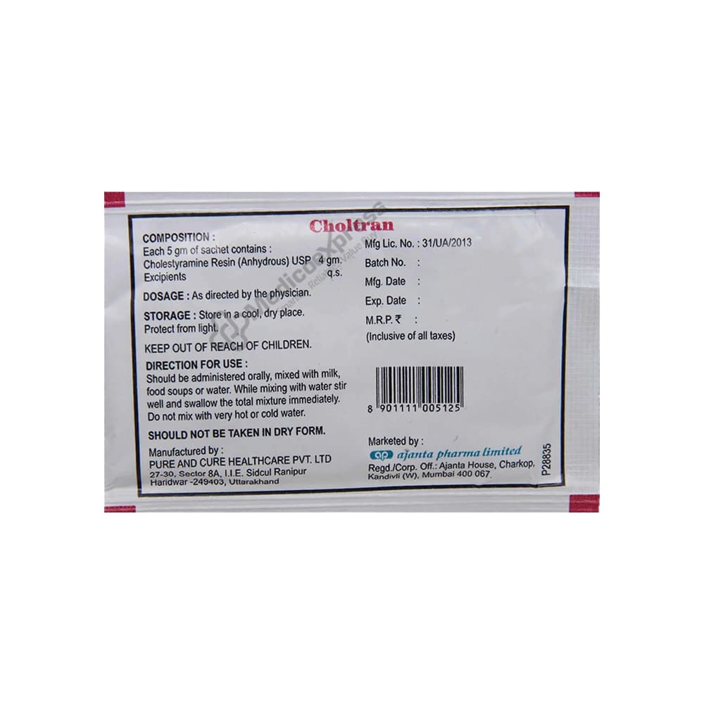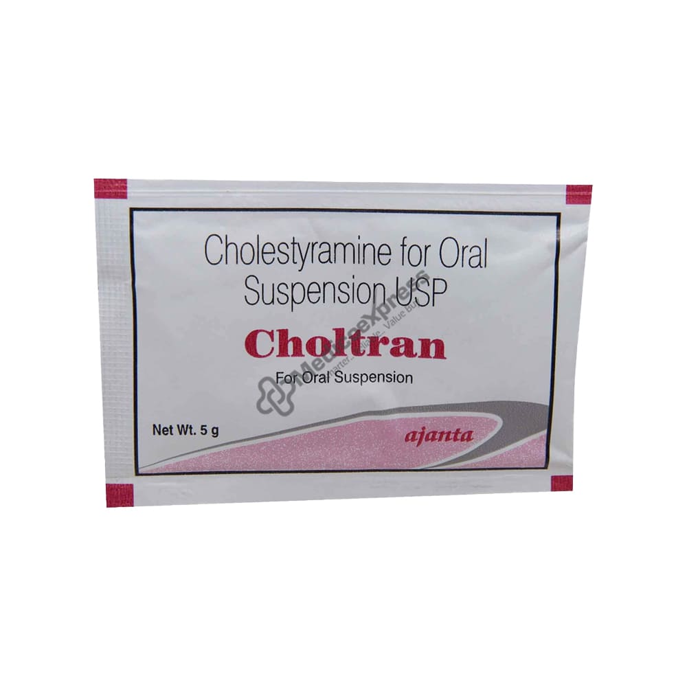 Choltran Oral Suspension Powder 5 gm is a cholesterol-lowering medicine known as bile acid-binding resins. It is primarily used to lower bad cholesterol levels, lowering the risk of future heart attacks and strokes.Disclaimer:For More Information Contact Your Physician