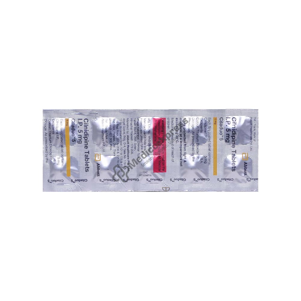 Ciladuo 5 mg Tablet 10's is used to treat high blood pressure (hypertension). It is a member of the calcium channel blocker drug class, which lowers blood pressure. By doing this, heart attacks and strokes are reduced. Additionally, it may be used to stop angina (heart-related chest pain). Ciladuo 5 mg Tablet may be prescribed either by itself or in combination with other drugs. The dosage is determined by how serious your condition is. It is recommended to take it at the same time each day, regardless of the time of day or whether you are eating. Continue taking it as long as your doctor instructs you to. Even if you feel fine, do not stop taking this medication on your own because high blood pressure frequently occurs.Disclaimer : For More Details, Contact Your Physician