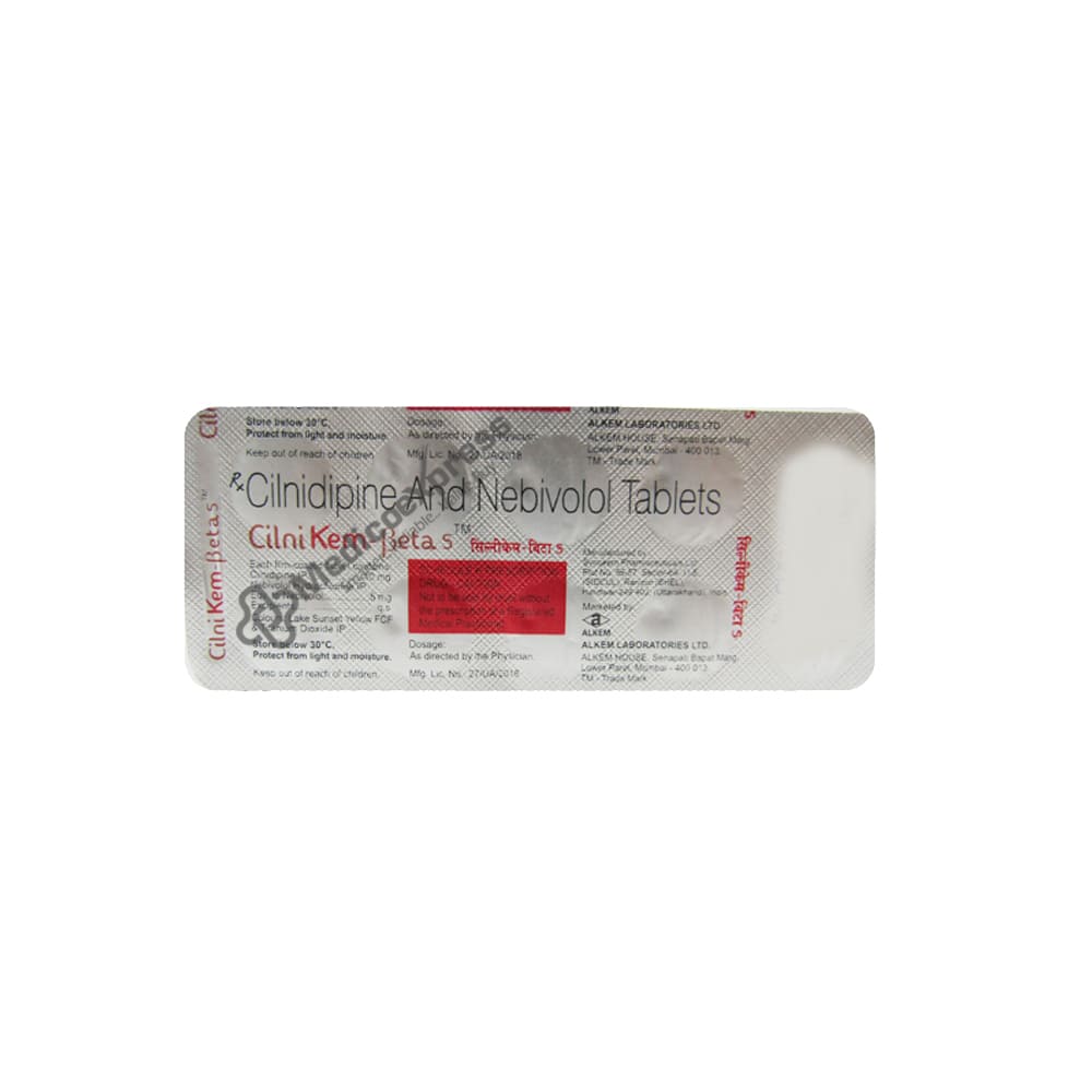Cilnikem Beta 5 mg Tablet 10 'S, which combines the antihypertensive drugs nebivolol and cilnidipine, is used to treat hypertension. It is used to treat essential hypertension, which is when your blood pressure is excessive but not due of a medical issue. The risk of heart disease, kidney disease, and stroke can all be raised by hypertension, a condition in which the blood's constant pressure against the artery walls is excessive. It is characterised by symptoms like nosebleed, severe headaches, dizziness, exhaustion, shortness of breath, chest pain, and dizziness. Patients with major kidney issues, lung conditions including asthma or wheezing, liver function issues, and heart conditions should not take Cilnikem Beta 5 mg Tablet 10 'S. Disclaimer:For more information contact your physician.