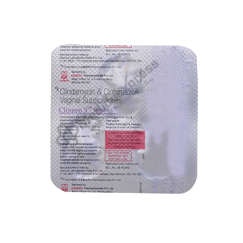 Clingen 3 Vaginal Suppository is a combination drug that is prescribed to treat various vaginal infections linked to vaginal discharge. It combats the infection by halting the development of infection-causing microorganisms. It also stops the infection from spreading further.Disclaimer : For More Details, Contact Your Physician