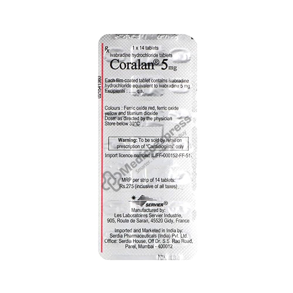 Coralan 5mg Tablet 14's Is a Medication That Belongs To The Class Of Hyperpolarization Activated Cyclic Nucleotide Gated Hcn Channel Blockers And Is Primarily Used To Treat Symptomatic Stable Angina Pectoris And Chronic Heart Failure.Disclaimer:For More Information Contact Your Physician