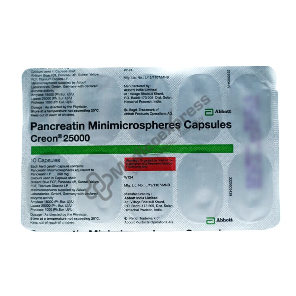 Creon 25000 Capsule 10's Belongs To a Class Of Medicine Known As 'Digestive Enzymes' Or 'Pancreatic Enzyme Supplement' And Is Used To Treat Malabsorption Syndrome Caused By Pancreas Problems, Boosting Digestion, And Deficiency Of Pancreatic Enzymes That Aid In Digestion.Disclaimer:For More Information Contact Your Physician