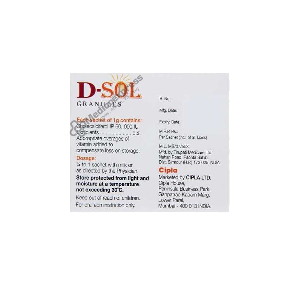 D-Sol Granules 1 gm is a vitamin that is primarily used to treat low blood calcium levels. D-Sol Granules 1 gm effectively treats a variety of conditions in the body, including vitamin D deficiency, osteoporosis (weak and brittle bones), hypoparathyroidism (parathyroid glands produce low levels of calcium in the body), latent tetany (a muscle disease characterised by low blood calcium levels), and rickets or osteomalacia (softening or deforming of bones due to lack of calcium).Disclaimer:For More Information Contact Your Physician