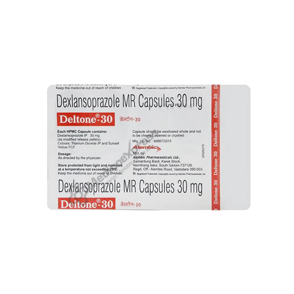 Deltone 30mg A capsule is a medication that reduces the amount of acid produced in your stomach. It is used to treat acid-related stomach and intestine diseases such as heartburn, acid reflux, peptic ulcer disease, and some other stomach conditions associated with excessive acid production.Disclaimer:For More Information Contact Your Physician