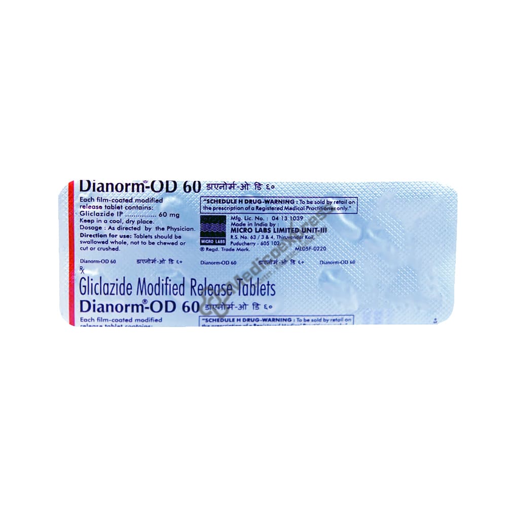 Dianorm od 60mg tablet 10's a diabetes medication. It aids in the reduction of blood sugar levels in adult patients with a known history of diabetes mellitus that cannot be controlled alone with exercise, diet, and insulin administration.Disclaimer:For more information contact your physician