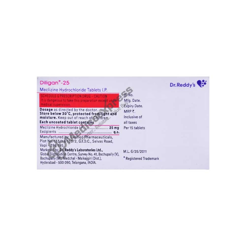 Diligan-25 mg Tablet 15, is generally used to treat motion sickness (also called motion sickness). Additionally, it is employed to cure sickness and vertigo brought by by inner ear issues (such as vertigo). Being nauseous while travelling by automobile, boat, plane, or train is known as motion sickness. When you or everyone around you experiences vertigo, it might throw your equilibrium off. There's more to it than just vertigo. Meclizine, an ingredient in Diligan-25 Tablet 15, is categorised as a sleepy (sedating) antihistamine. It inhibits histamine's brain-damaging actions to lessen motion sickness symptoms. It also has calcium channel blocking properties. This lessens vertigo symptoms by enhancing blood flow to the inner ear.Disclaimer:For more information contact your physician.