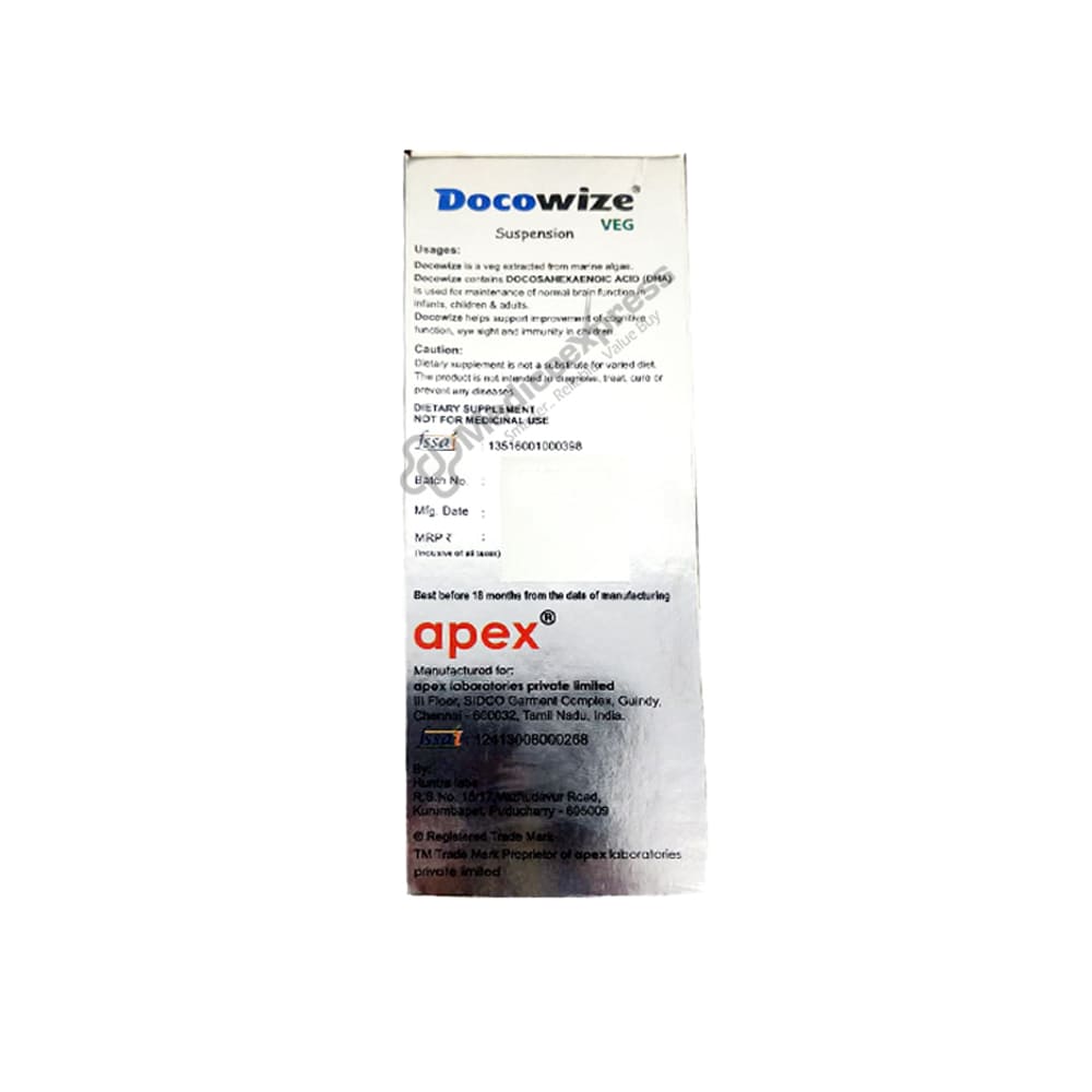 Docowize Veg Suspension 100 ml which contains the vital nutrition omega 3 fatty acid. helps the enhancement of memory, thinking, and learning abilities. For infants, kids, and adults alike, it is necessary to maintain optimal brain function.Disclaimer:For more information contact your physician.