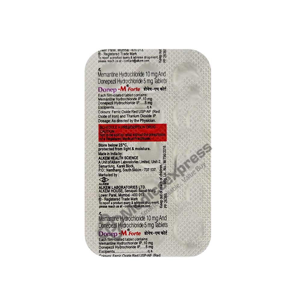 DONEP M FORTE Tablet 15's is a medication that combines the drugs Donepezil and Memantine, which are both acetylcholinesterase inhibitors and NMDA receptor antagonists, respectively. It is used to treat Alzheimer's disease-related dementia (Alzheimer's type dementia) in individuals who have previously received donepezil alone. Alzheimer's type dementia is a form of brain disease in which the dementia (abnormalities in thinking, memory, and behaviour) are brought on by the ageing of memory-carrying brain cells. Acetylcholinesterase inhibitor donepezil is used. It works by raising the amounts of acetylcholine, a substance that transmits messages between nerve cells in the brain. An antagonist of the NMDA receptor is memantine. It works by preventing the overactivation of specific brain chemicals (such as glutamate) that harms nerve cells.Disclaimer:For more information contact your physician.