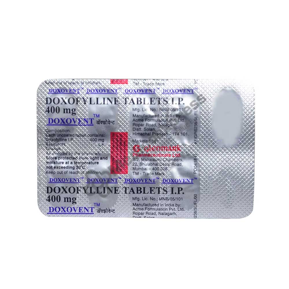 Doxovent 400mg Tablet 10'S, is a member of the class of drugs known as bronchodilators. Asthma and chronic obstructive pulmonary disease are both treated with it (COPD). Additionally, it can be used to lessen apnea, or difficulty breathing, and other respiratory conditions linked to bronchospasm (tightening of airways). A chronic respiratory condition called asthma causes your airways to swell, swell up, and narrow. Additionally, it results in excessive mucus secretion in the airways, which makes it harder for air to flow through and causes uncomfortable symptoms including coughing, wheezing, and/or breathing difficulties, as well as chest pain. Chronic lung inflammation and blocked airways are two features of the lung illness COPD. It results in chest pain, coughing up mucus, wheezing, and breathing problems.Disclaimer:For more information contact your physician.