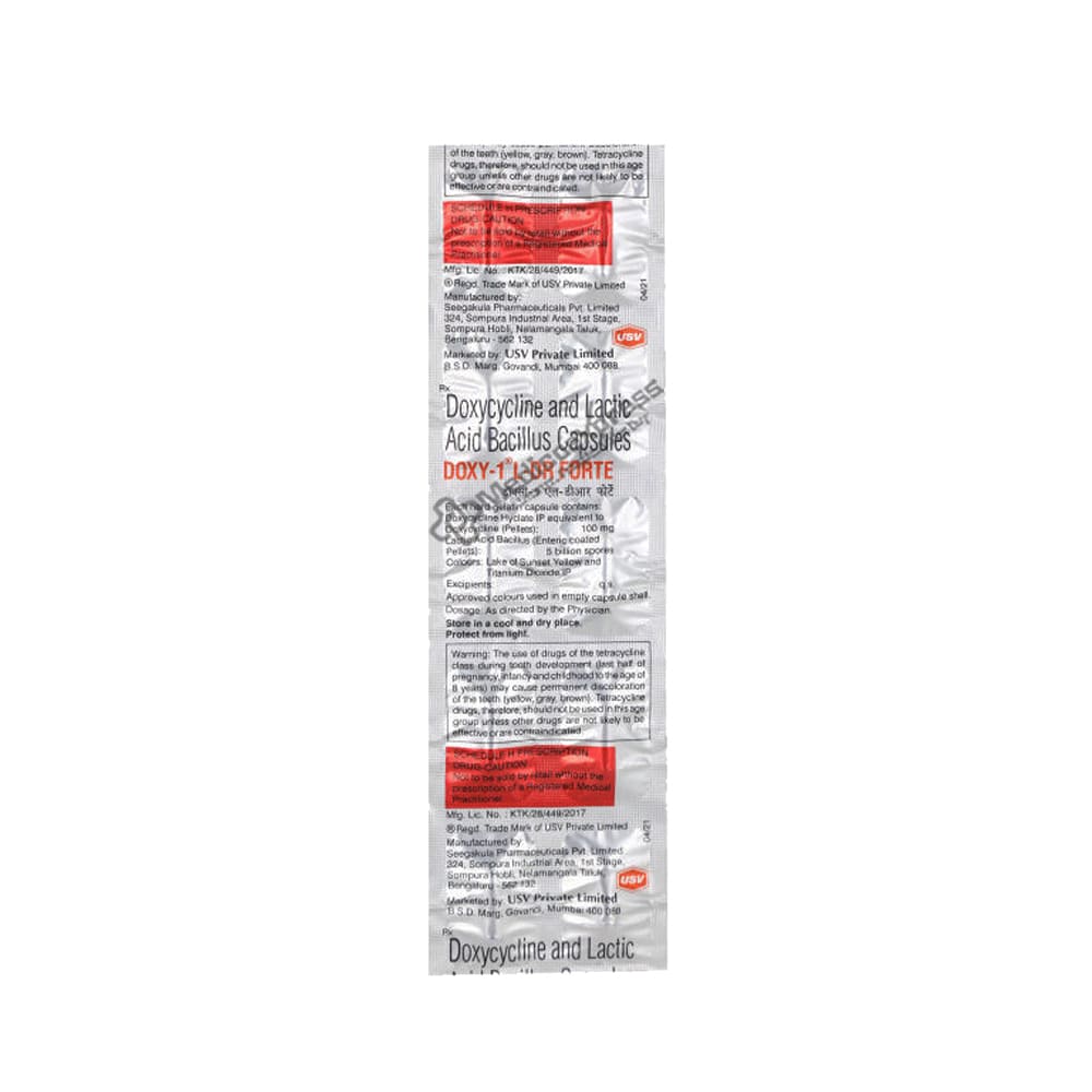 Doxy 1 l dr forte strip of 10 capsules has antibiotic doxypal dr-l pill as active ingredients, it comprises doxycycline and lactobacillus sporogenes spores.Disclaimer:For more information contact your physician