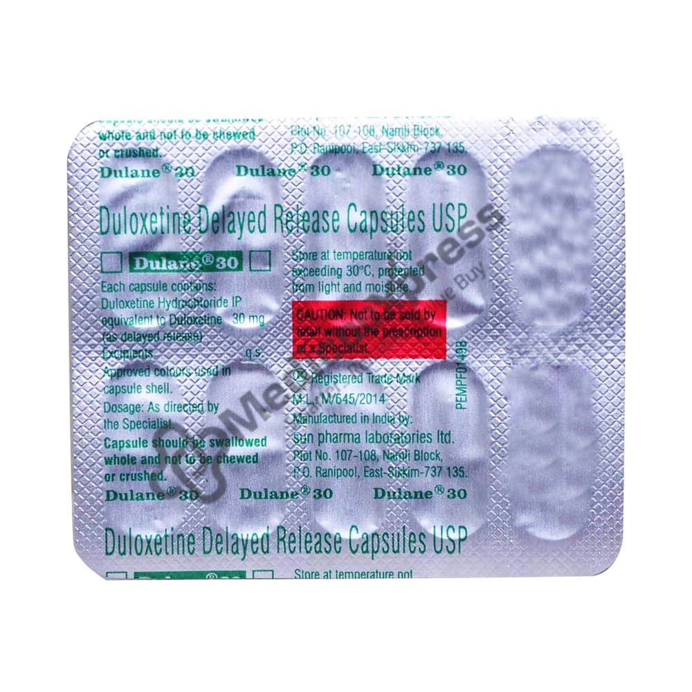 DULANE 30MG contains duloxetine, a medication that belongs to a class of drugs known as serotonin-norepinephrine reuptake inhibitors (SNRIs). It is used to treat depression, generalised anxiety disorder, and diabetic neuropathic pain in adults. It works by increasing the levels of chemical messengers in the brain, such as serotonin and noradrenaline, which help maintain mental balance and stop the movement of pain signals.Disclaimer:For More Information Contact Your Physician