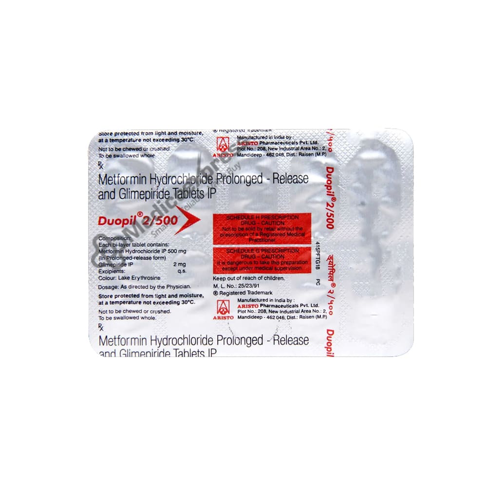 Duopil 2/500 Tablet 10's is an anti-diabetic medication used to treat type 2 diabetes, particularly in patients whose blood sugar levels are not controlled by diet and exercise alone. Type 2 diabetes is a long-term condition that affects how our bodies process glucose. Type 2 diabetes patients either do not produce enough insulin or the insulin they do produce is unable to perform its function in the body (insulin resistance).Disclaimer:For More Information Contact Your Physician