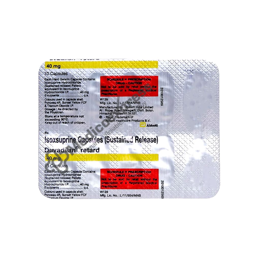 Duvadilan Retard 40 mg Capsule is a 'vasodilator' (blood vessel relaxing agent) medication that is used to treat and prevent Raynaud's phenomenon, cerebral vascular insufficiency (poor blood flow to the brain), arteriosclerosis (hardening of the arteries), and other conditions involving poor blood flow in the blood vessel.Disclaimer:For More Information Contact Your Physician