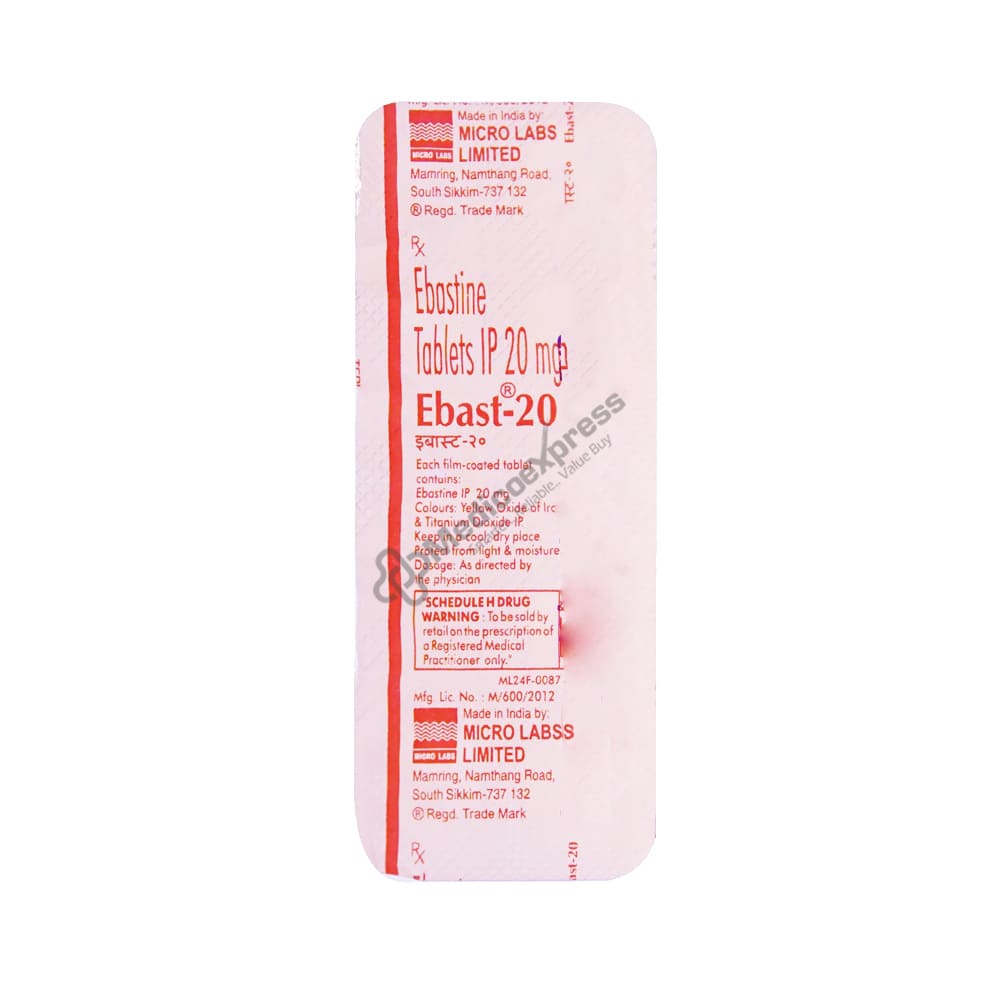 Ebast 20 Tablet 10's a Histamine H1 Receptor Antagonist That Is Primarily Used To Treat Allergic Reactions Such As Seasonal Allergies, Hay Fever, Allergic Rhinitis, Chronic Allergic Rhinitis (Stuffy Nose), And Allergic Conjunctivitis (Eye Allergies)Disclaimer:For More Information Contact Your Physician