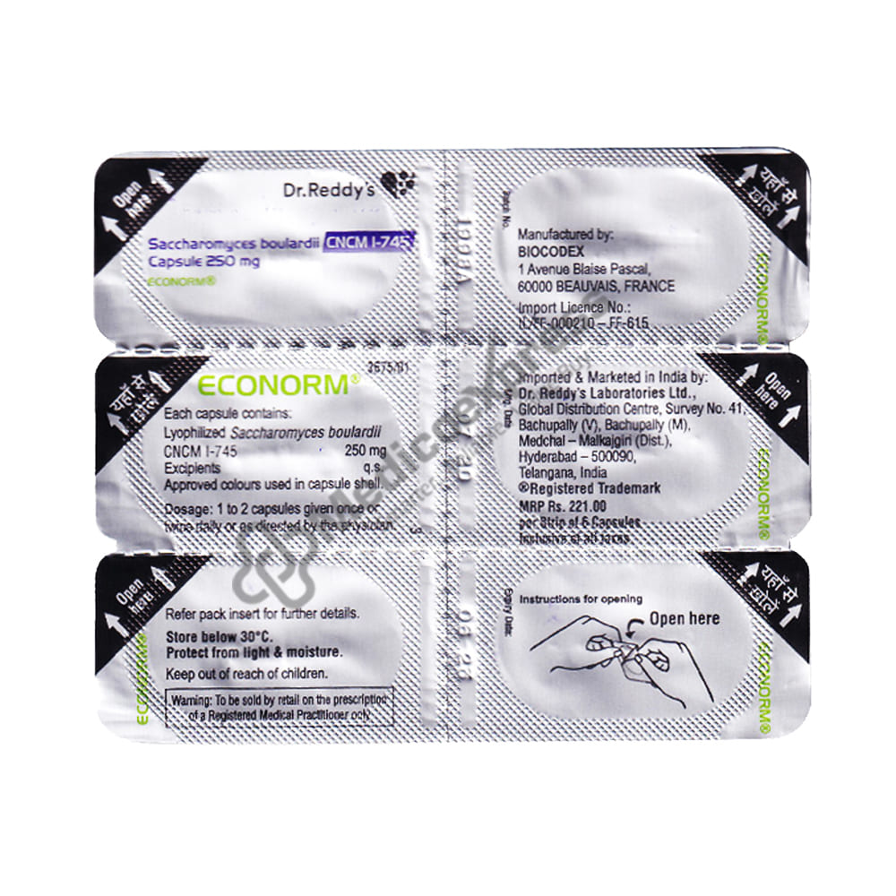 Econorm 250 mg capsule 5's belongs to a class of drugs known as probiotics, which are used to treat and prevent diarrhoea, including rotaviral diarrhoea in children.Disclaimer:For more information contact your physician
