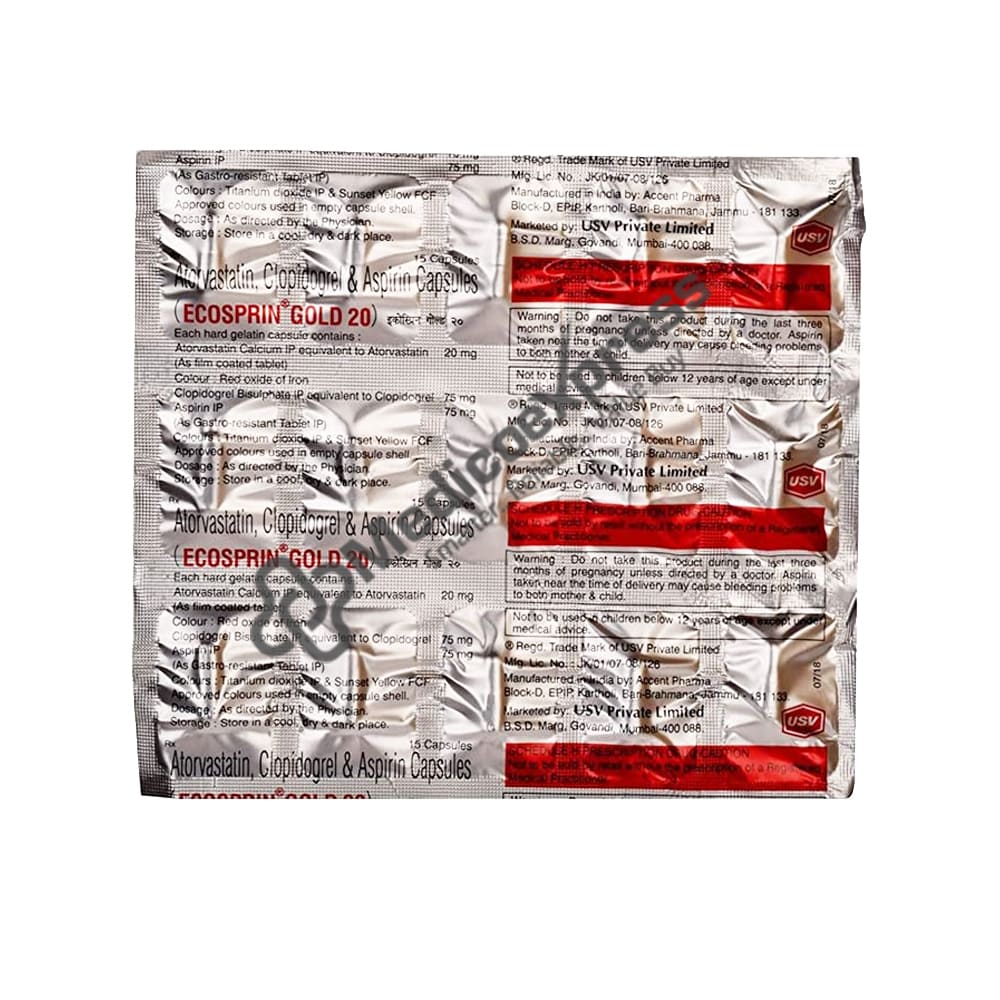 Ecosprin Gold 20 Capsule 15's is a medication that combines blood-thinning and cholesterol-lowering medicines and is used to prevent heart attacks and strokes.Disclaimer:For More Information Contact Your Physician