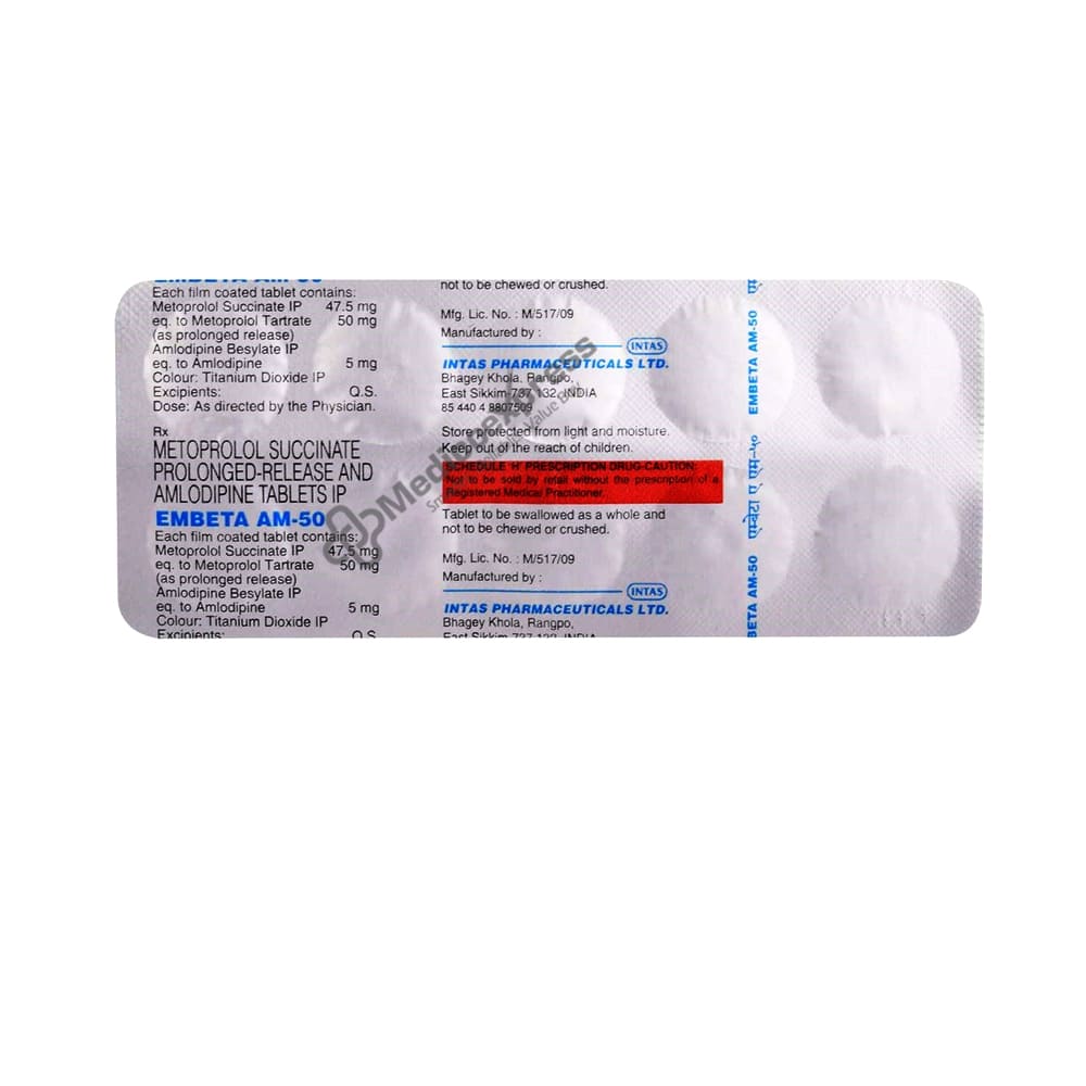 Embeta Am-50 Tablet 10's An Antihypertensive Medication Used To Treat High Blood Pressure/Hypertension And Angina Pectoris.Disclaimer:For More Information Contact Your Physician