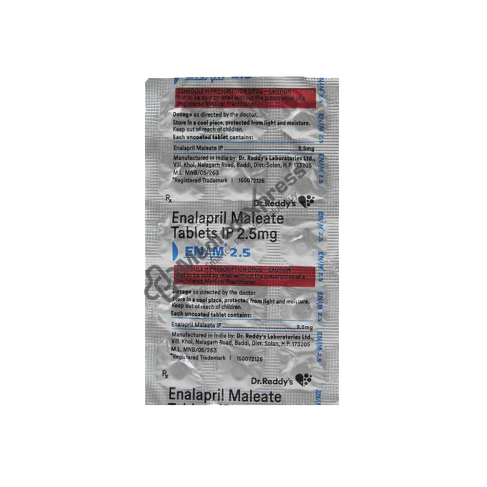 Enam 2.5mg Tablet 15'S contains Enalapril, a medication in the Angiotensin Converting Enzyme (ACE) Inhibitors class of drugs. Heart failure and high blood pressure are two conditions it is used to treat. Furthermore, it delays the appearance of heart failure's warning signs and symptoms (such as difficulty in breathing, swollen ankles and feet or extreme tiredness even after a mild physical activity). If you have any heart, liver, or renal issues before using Enam 2.5mg Tablet 15'S, let your doctor know (other than hypertension and heart failure). Additionally, if you have diabetes, are on a low-sodium diet, or are extremely dehydrated as a result of a recent illness, you must let your doctor know (such as vomiting or diarrhea). For patients with severe hypotension, Enam 2.5mg Tablet 15'S is not advised.Disclaimer:For more information contact your physician.