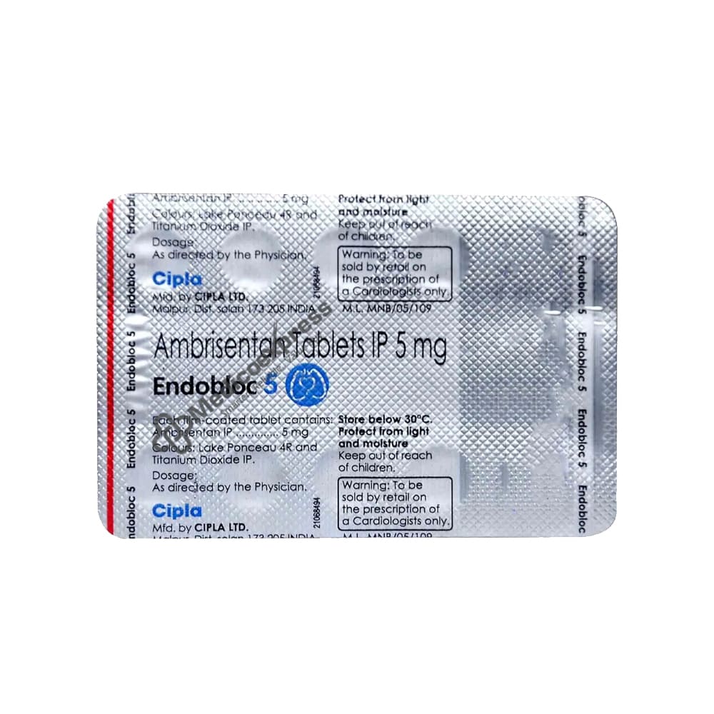 Endobloc 5 Tablet 10's is a 'anti-hypertensive drug' that is primarily used to treat high blood pressure in the arteries of the lungs (pulmonary arterial hypertension).Disclaimer:For More Information Contact Your Physician
