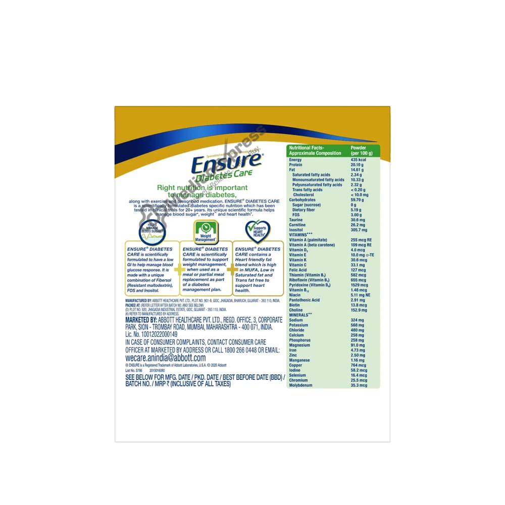 Ensure Chocolate Diabetes Care is a powdered dietary supplement that helps the body's blood sugar levels stay balanced. Diabetes care can help diabetic patients maintain overall health along with appropriate moderation in daily activities like regular exercise. For diabetic patients, this product also ensures that fatigue and hunger pangs are controlled, improving their quality of life.Disclaimer : For More Details, Contact Your Physician