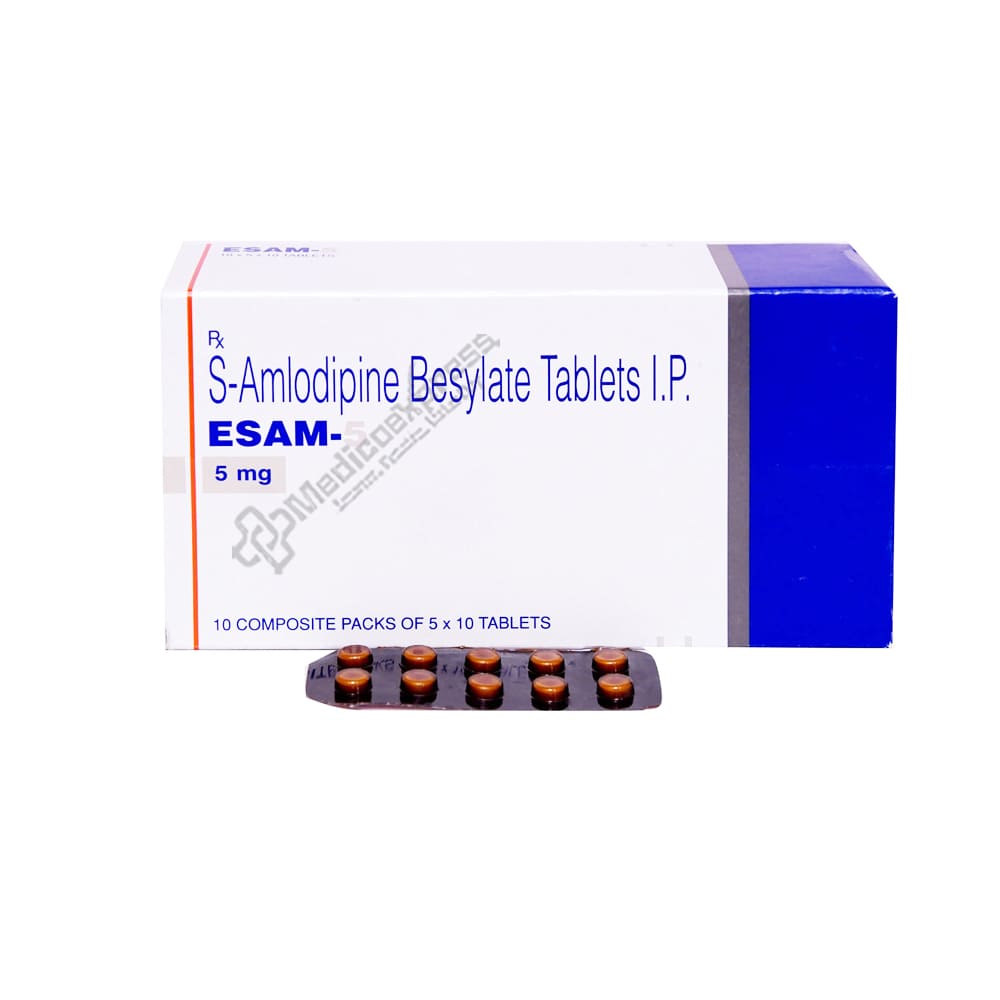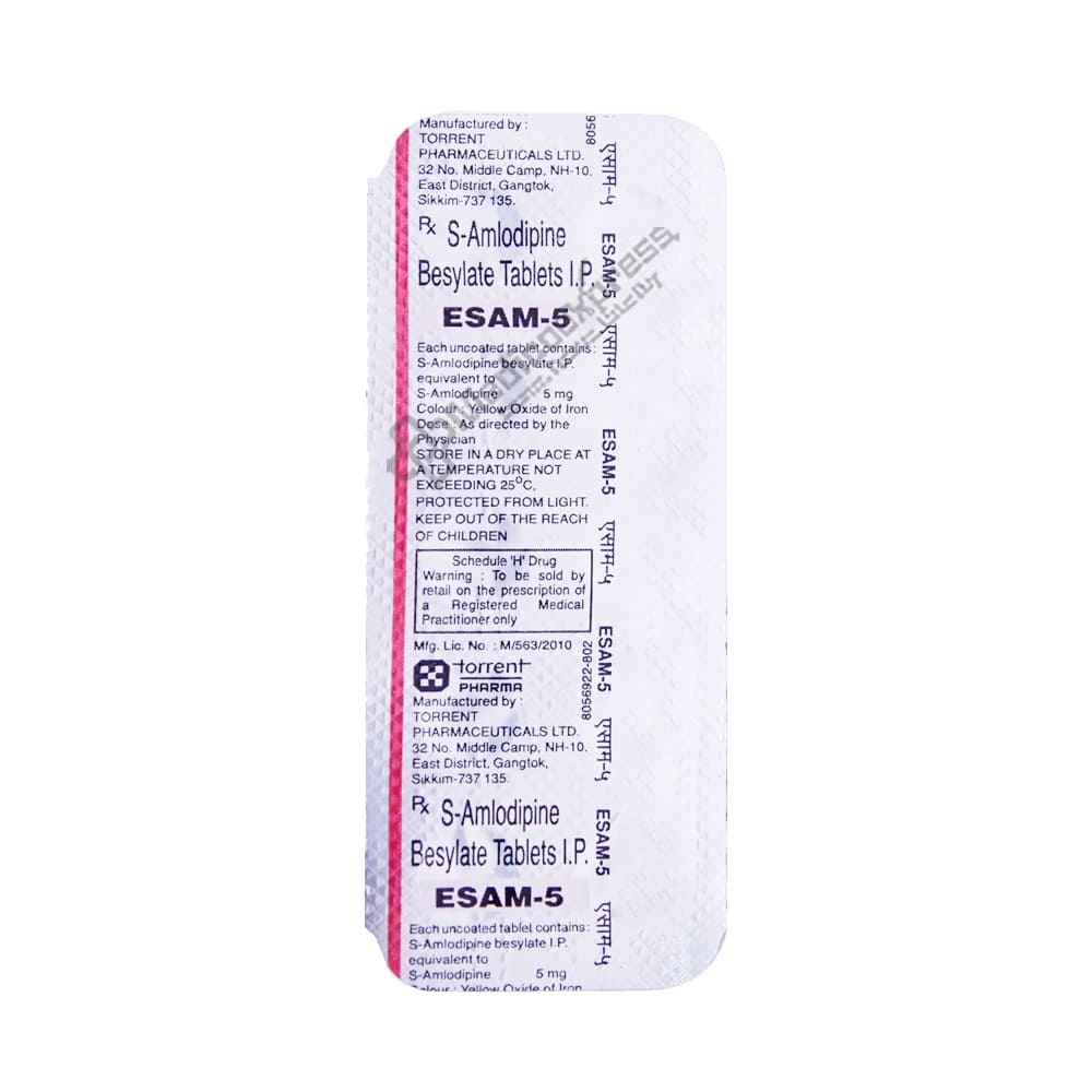 Esam 5 tablet 10's a calcium channel blocker medication that is used to treat hypertension (high blood pressure) and angina (chest pain).Disclaimer:For more information contact your physician