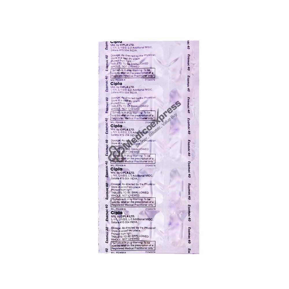 Esomac 40 Tablet 15 belongs to the Proton pump inhibitor class of drugs, which reduces the amount of acid produced by your stomach. It is used to treat gastroesophageal reflux disease (GERD), stomach ulcers, and the Zollinger Ellison syndrome (overproduction of acid due to pancreatic tumour).Disclaimer:For More Information Contact Your Physician
