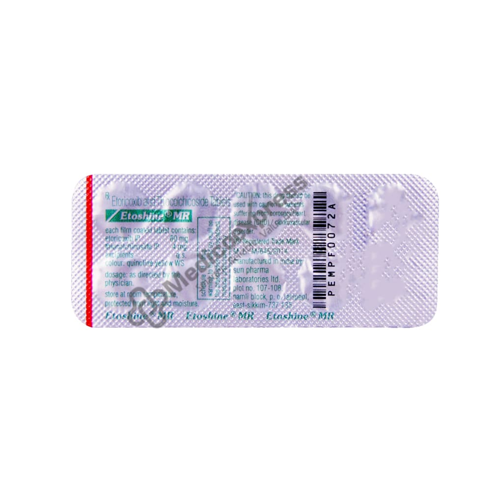 Etoshine MR Tablet 10 is a Non-Steroidal Anti-Inflammatory Drug (NSAID) that is used to treat osteoarthritis, rheumatoid arthritis, gouty arthritis, and ankylosing spondylitis, as well as acute pain, chronic low back pain, and muscle spasms.Disclaimer:For More Information Contact Your Physician