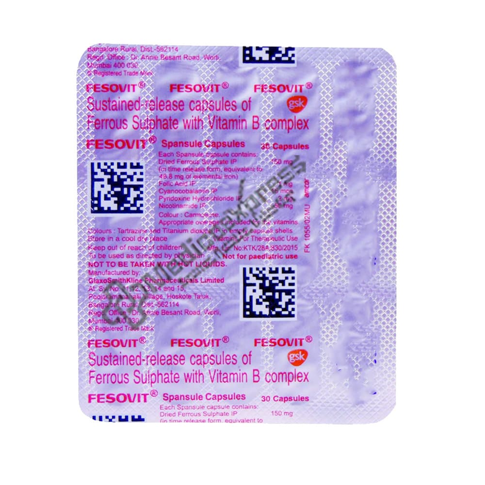 Fesovit spansule capsule 30’s used to treat iron deficiency anaemia, iron deficit due to chronic blood loss, and iron deficiency due to insufficient iron consumption.Disclaimer:For more information contact your physician