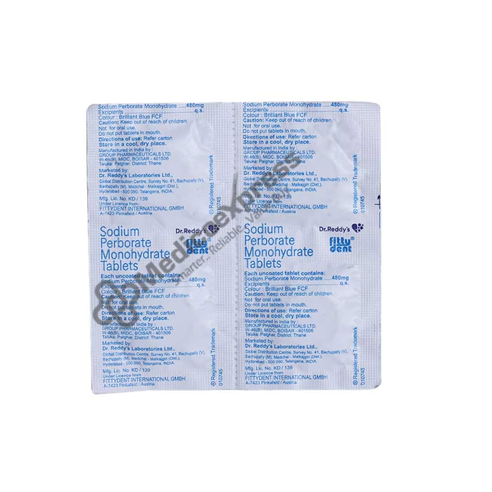Fittydent Tablet 4's removes residue and keeps orthodontic and denture equipment ready for use. Its key ingredient, sodium perborate monohydrate, cleans away all non-water-soluble residues and keeps the gadgets extra-smooth and clear. Active oxygen is present in sodium perborate monohydrate, which is also used as a bleaching agent. In contact with water, sodium perborate monohydrate hydrolyzes into hydrogen and borate, leaving a smooth, clean surface. Fittydent Tablet should only be used as directed by your dentist. Do not swallow these tablets. Take off your dentures and use a toothbrush and running water to clean them. Put a pill into some warm water. Use just ice-cold water. Denture or brace should be soaked in the remedy for at least 10 - 15 minutes.Disclaimer:For more information contact your physician.