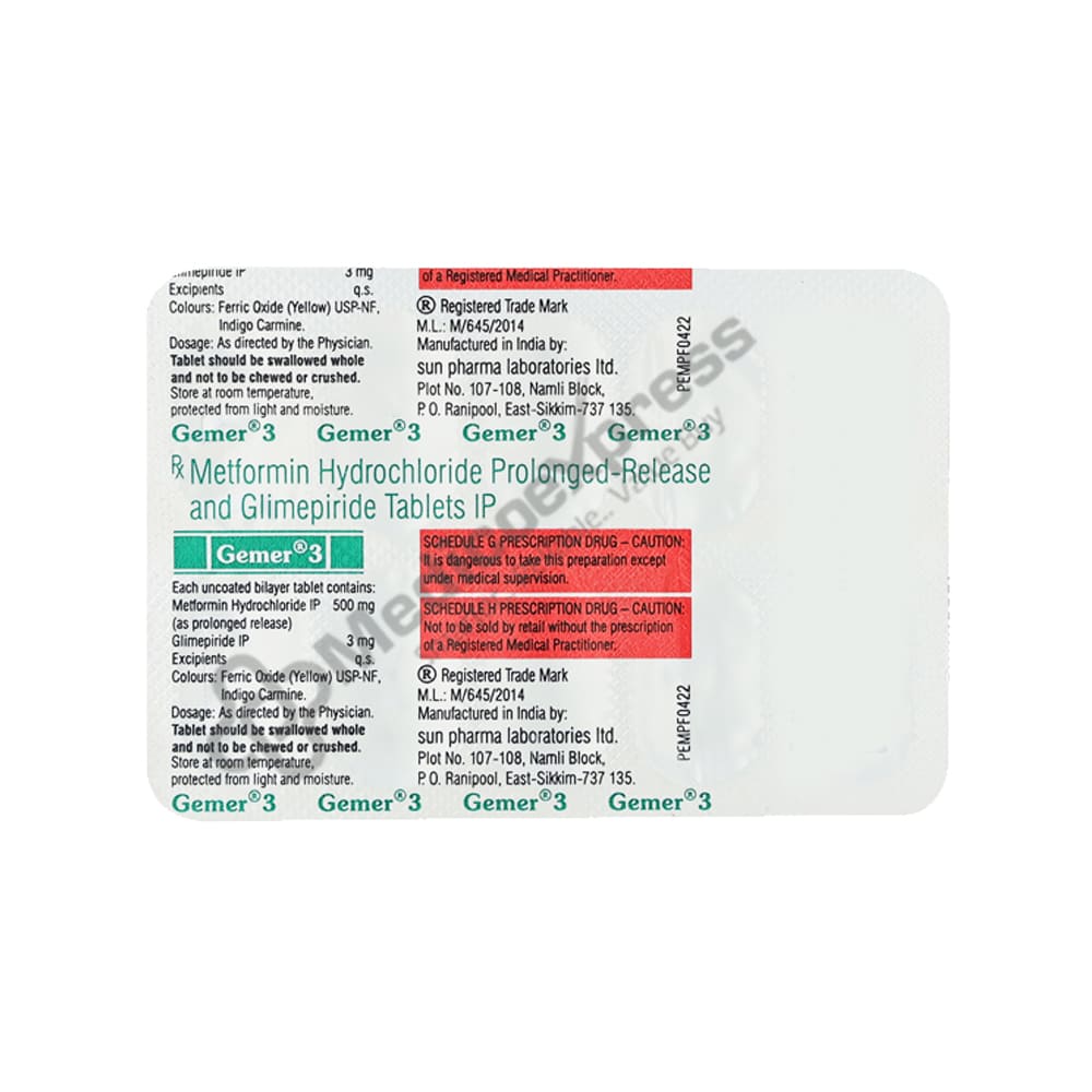 Gemer 3 tablet is a diabetes treatment. It is made up of the active ingredients glimepiride and metformin. When glimepiride or metformin alone are ineffective in managing blood sugar levels in type 2 diabetes, Gemer 3 tablet is used.Disclaimer:For More Information Contact Your Physician