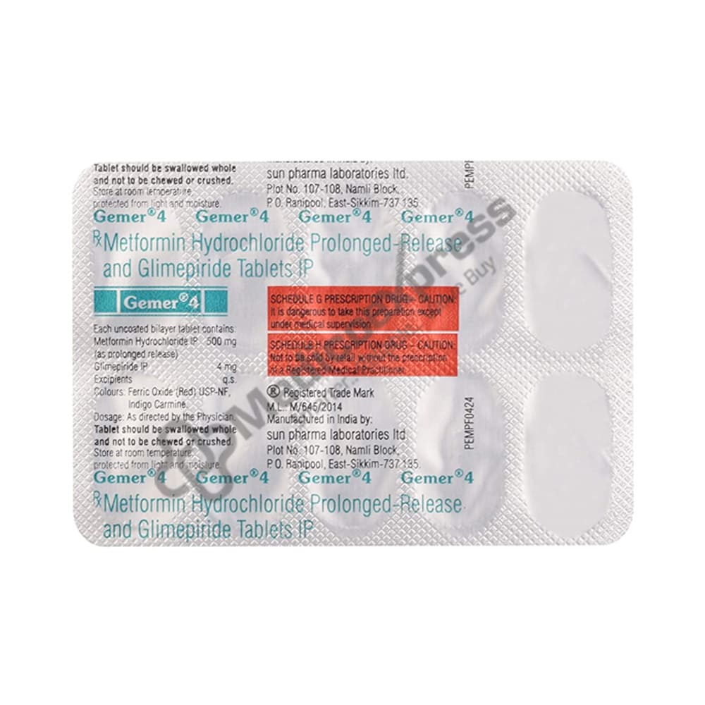 GEMER 4MG TABLET 10'S is an anti-diabetic medication used to treat type 2 diabetes, particularly in patients whose blood sugar levels are not controlled by diet and exercise alone.Disclaimer:For More Information Contact Your Physician
