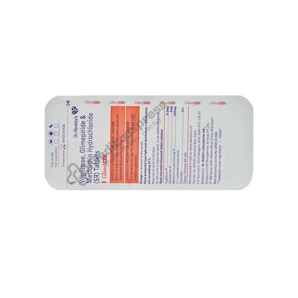 Glimy M V 2 Mg Tablet 10's are part of a group of pharmaceuticals known as anti-diabetic drugs that are used to treat type 2 diabetes, particularly in people whose blood sugar levels are not under control via diet and exercise alone. Type 2 diabetes affects how our bodies metabolise glucose and is a chronic (long-lasting) disorder. In people with type 2 diabetes, the amount of insulin produced is either insufficient or the insulin cannot work properly in the body (insulin resistance). Glimepiride and metformin are the two anti-diabetic medications included in Glimy Glimy M V 2 Mg Tablet 10's. The way glimepiride works is by activating the pancreatic beta cells that make insulin. As a result, insulin aids in the elimination of blood sugar. Metformin PR is a prolonged-release medication that disperses the substance over a longer period of time.Disclaimer:For more information contact your physician.