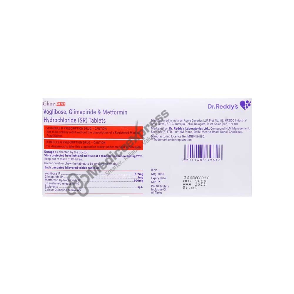 Glimy M V1 Mg Tablet 10's are part of a group of pharmaceuticals known as anti-diabetic drugs that are used to treat type 2 diabetes, particularly in people whose blood sugar levels are not under control via diet and exercise alone. Type 2 diabetes affects how our bodies metabolise glucose and is a chronic (long-lasting) disorder. In people with type 2 diabetes, the amount of insulin produced is either insufficient or the insulin cannot work properly in the body (insulin resistance). Glimepiride and metformin are the two anti-diabetic medications included in Glimy M V1 Mg Tablet 10's. The way glimepiride works is by activating the pancreatic beta cells that make insulin. As a result, insulin aids in the elimination of blood sugar. Metformin PR is a prolonged-release medication that disperses the substance over a longer period of time.Disclaimer:For more information contact your physician.